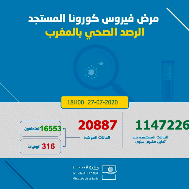 Lire la suite... 1 minute de lecture A la Une Société Le Maroc enregistre 609 nouvelles contaminations en 24h 609 nouvelles contaminations ont été enregistrées jusqu’à ce 27 juillet à 18h00 portant le bilan national à 20.887.…